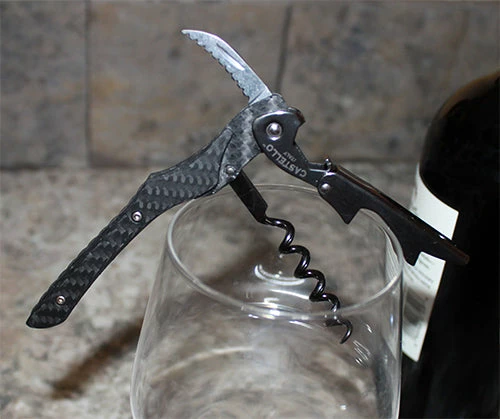 If you are looking for a high quality wine key, then this is the one you want! The Castello™ Carbon Fiber Handle Corkscrew is a top of the line wine bottle opener. It features a sleek carbon fiber handle, two-step lever, serrated foil cutting blade, bottle cap remover, and stainless steel metal parts treated with PVD. This unique professional corkscrew was designed in Italy and built with the precision of a race car.