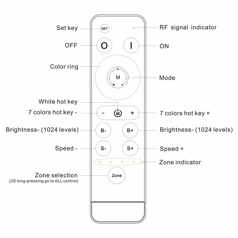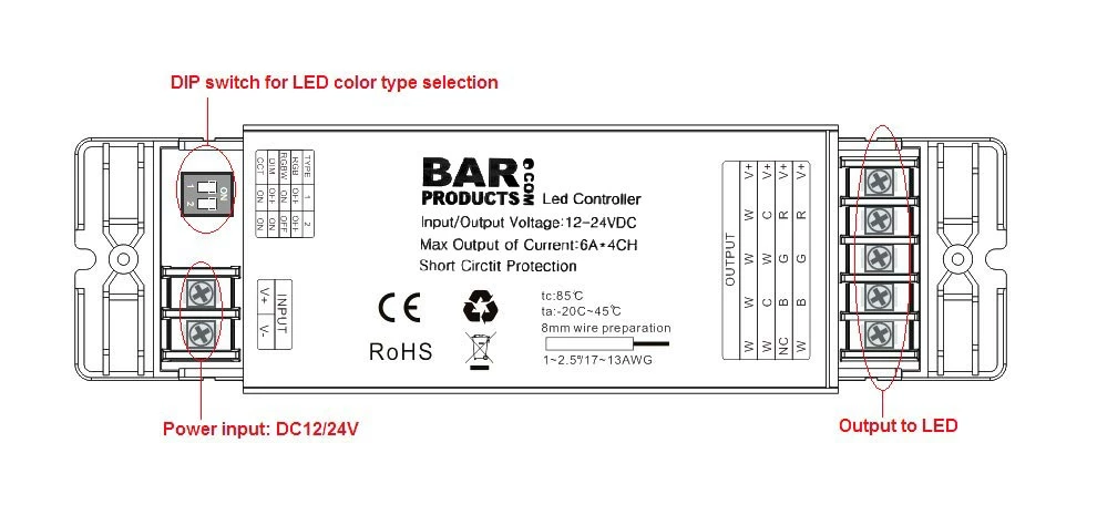 This controller has the most advanced PWM (Pulse Width Modulation) digital control technology and is used for controlling constant voltage LED lights, such as LED strips and other devices. It has a low-voltage DC power input and output with five interfaces. Four inputs are for the 4 channels output control interface. This controller allows you to adjust brightness, static color, and other dynamic color changes in lighting effects using the RF (Radio Frequency) remote control.