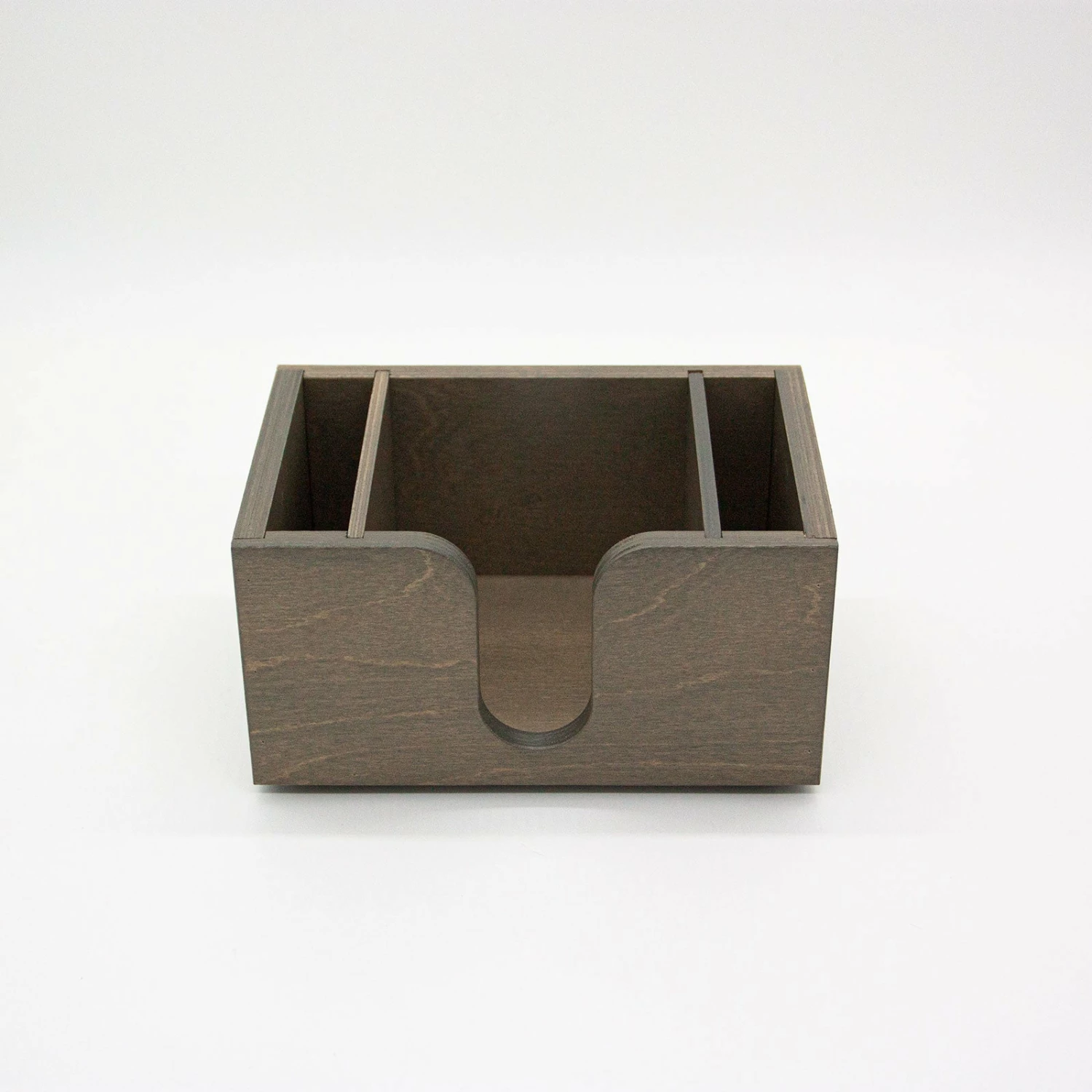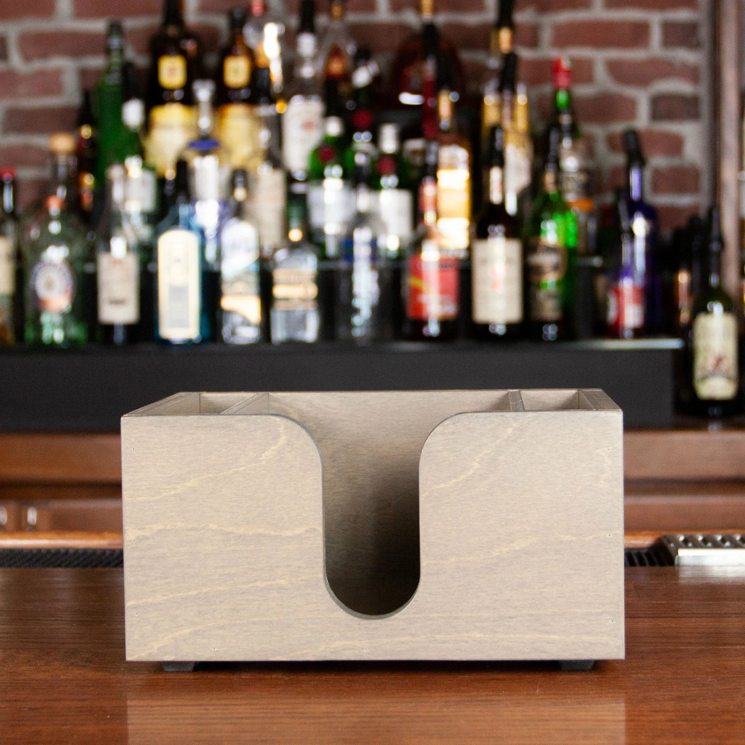 This beautifully rustic wooden Bar Caddy is an exceptional addition to any type of bar setting! The quality of craftsmanship (handmade in the USA) is beyond compare. Designed with 3 compartments perfect for storing your beverage napkins, straws, and stirrers. Designed to hold traditional-sized beverage napkins and features 2 side pockets perfect for your straws, stirrers, and/or cocktail picks. These caddies have a beautiful, elegant earl grey finish.
