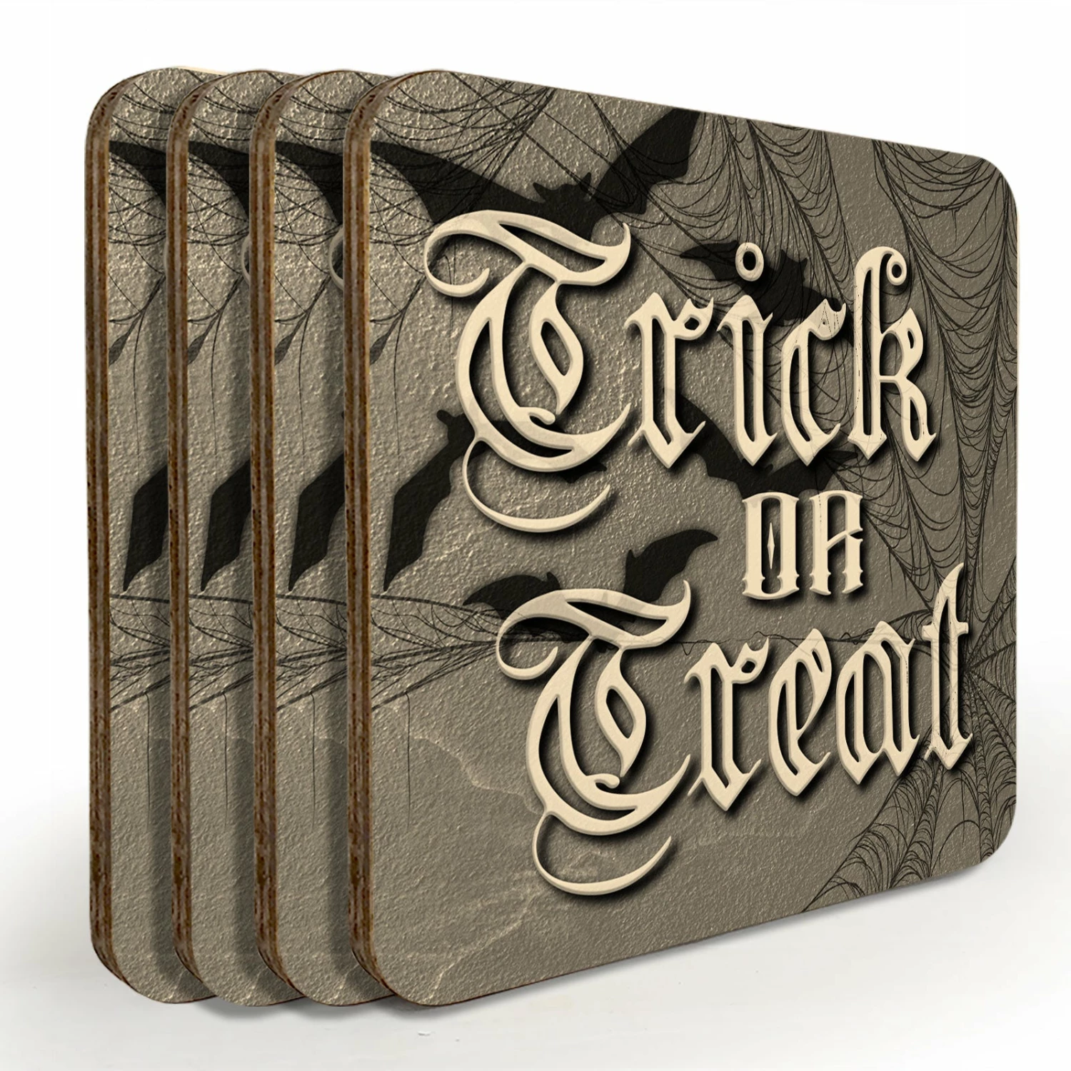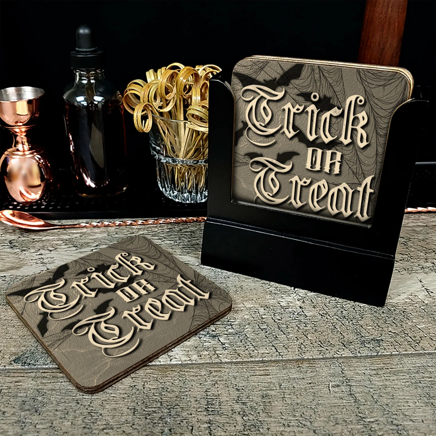 Looking for a non-disposable coaster solution that will look phenomenal displayed on your bar or table tops? How about one that showcases a spooky “Trick or Treat” design theme? These custom wood coasters are just what you’ve been looking for! Handcrafted in the USA, these high-quality coasters allow for full-color design for your customization. These coasters also make for a great gift idea! 4-inch square shape with rounded corners. Sold in packs of 4 with a wooden coaster caddy.