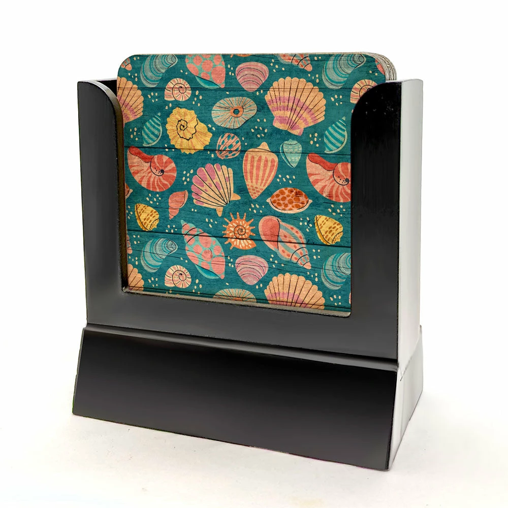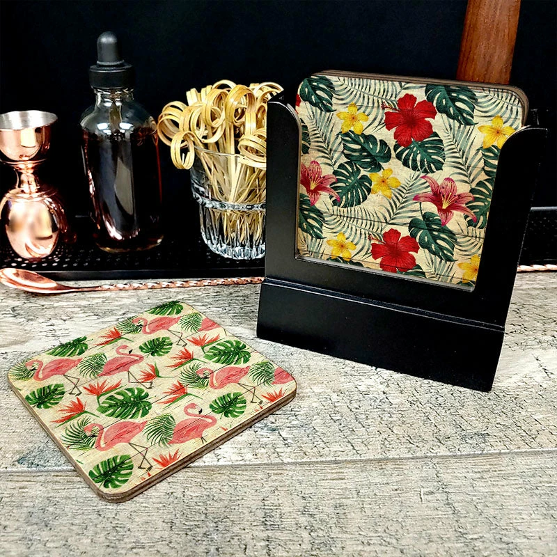 Relax with a tropical twist! Our Wooden Coasters – Tropical – Set of 4 w/ Coaster Caddy brings island vibes to your bar with a fun flamingo, seashells, pineapple and floral motif. Keep your surfaces dry – now that’s cooler than a pineapple under the sea!